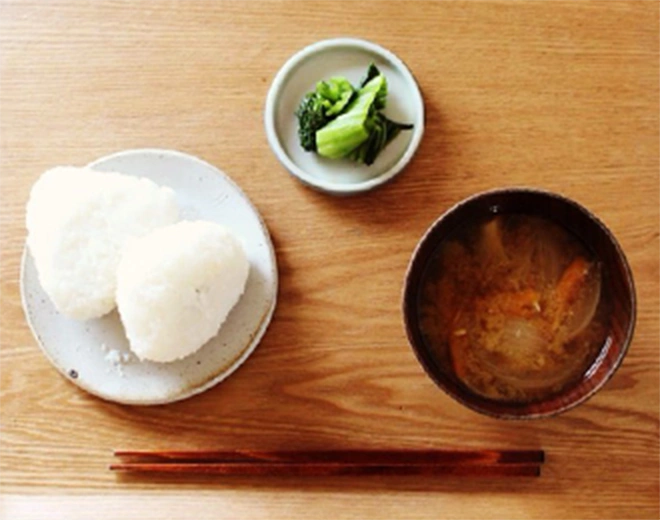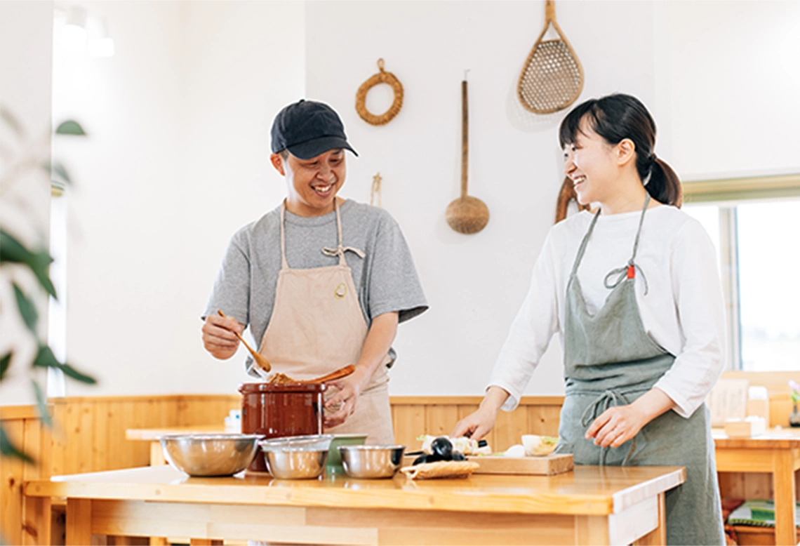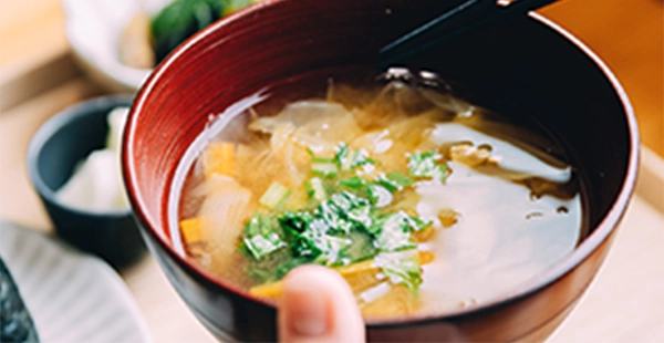 化学肥料・農薬不使用のまめくら畑の野菜だし(ベジブロス)と、自家製のにおい豆味噌を使った、体と心にやさしいお味噌汁です。